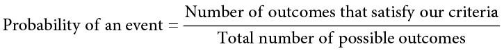 To calculate the probability of an event, which here is defined as rolling a 1 on an unbiased die, we need to know two things: how many outcomes satisfy the criteria of our event (stated differently, how many outcomes would count as what we are looking for) and the total number of outcomes possible. In our example, only a single outcome, rolling a 1, will satisfy our criteria, and there are a total of six possible outcomes (rolling a 1, rolling a 2, rolling a 3, rolling a 4, rolling a 5, and rolling a 6). Thus, the probability of rolling a 1 on an unbiased die is 1 in 6 or 1/6. Put into an equation using generic terms, we get: