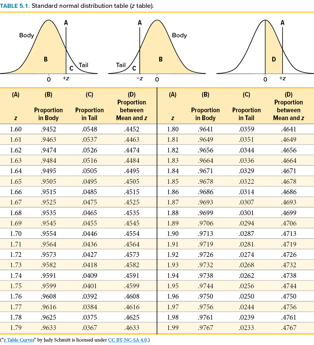 As you can see, we can break up the normal distribution into 3 pieces (lower tail, body, and upper tail) as in Figure 5.2 or into 2 pieces (body and tail) as in Figure 5.3. We can then find the proportion of the area in the body and tail based on where the line was drawn (i.e., at what z score). Mathematically, this is done using calculus. Fortunately, the exact values are given to you in the Standard Normal Distribution Table, also known at the z table. A portion of this table is shown in Figure 5.1. (The entire table appears in Appendix A.) Using the z values in the table (A), we can find the area under the normal curve in any body (B), tail (C), or combination of tails, as well as the proportion between z and the mean (D).
