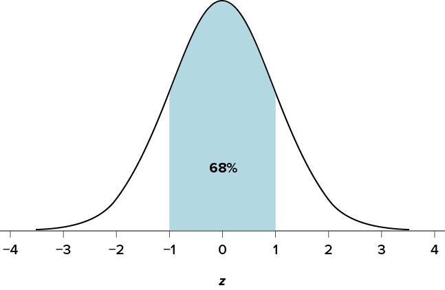 First, let’s look at the area between z = −1.00 and z = 1.00 presented in Figure 5.2. We were told earlier that this region contains 68% of the area under the curve. Thus, if we randomly chose a z score from all possible z scores, there is a 68% chance that it will be between z = −1.00 and z = 1.00 because those are the z scores that satisfy our criteria.