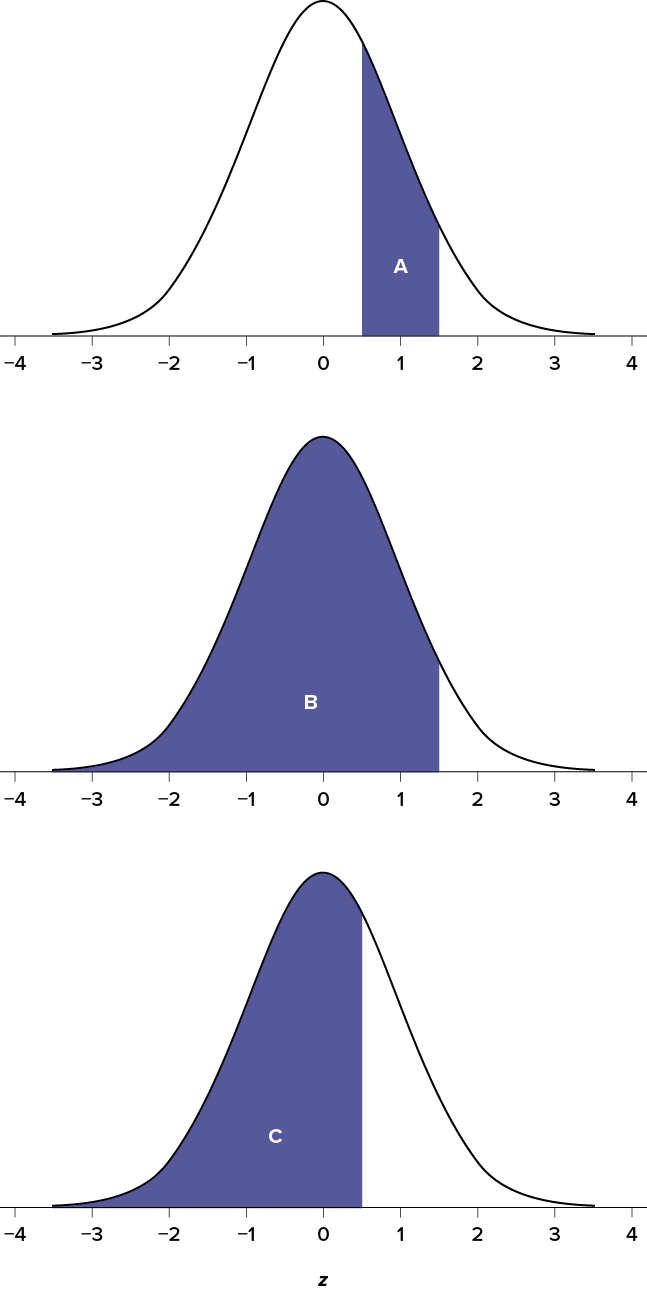 Finally, we can find the area between two z scores by shading and subtracting. Figure 5.5 shows the area between z = 0.50 and z = 1.50. Because this is a subsection of a body (rather than just a body or a tail), we must first find the larger of the two bodies, in this case the body for z = 1.50, and subtract the smaller of the two bodies, or the body for z = 0.50. Aligning the distributions vertically, as in Figure 5.5, makes this clearer. From the complete z table in Appendix A, wee see that the area in the body for z = 1.50 is .9332, and the area in the body for z = 0.50 is .6915. Subtracting these gives us .9332 − .6915 = .2417.