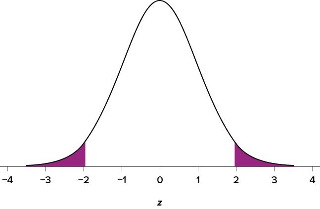 Let’s look at another example. This time, let’s find the area corresponding to z scores more extreme than z = −1.96 and z = 1.96. That is, let’s find the area in the tails of the distribution for values less than z = −1.96 (farther negative and therefore more extreme) and greater than z = 1.96 (farther positive and therefore more extreme). This region is illustrated in Figure 5.4.