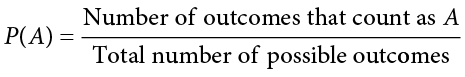 where P(A) is the probability of event A and is equal to, the number of outcomes in event A, divided by and the total number of possible outcomes in the sample space. For example, when flipping a fair coin, the probability of getting heads can be written as: