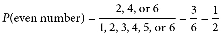 Using this equation, let’s now calculate the probability of rolling an even number on this die: