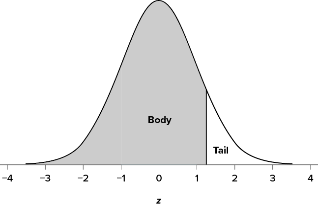 Just like a pie chart is broken up into slices by drawing lines through it, we can also draw a line through the normal distribution to split it into sections. Take a look at the normal distribution in Figure 5.3, which has a line drawn through it at z = 1.25. This line creates two sections of the distribution: the smaller section called the tail and the larger section called the body. Differentiating between the body and the tail does not depend on which side of the distribution the line is drawn. All that matters is the relative size of the pieces: bigger is always body.