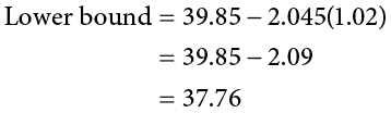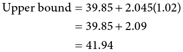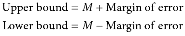 Once we have our margin of error calculated, we add it to our point estimate for the mean to get an upper bound to the confidence interval and subtract it from the point estimate for the mean to get a lower bound for the confidence interval: