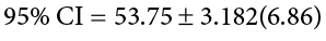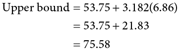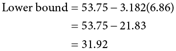 Let’s see what this looks like with some actual numbers by taking our welfare application data and using it to create a 95% confidence interval estimating the average length of time it takes to receive benefits. We already found that our average was M = 53.75 days and our standard error was = 6.86. We also found a critical value to test our hypothesis, but remember that we were testing a one-tailed hypothesis, so that critical value won’t work. To see why that is, look at the column headers on the t table. The column for one-tailed a = .05 is the same as a two-tailed a = .10. If we used the old critical value, we’d actually be creating a 90% confidence interval (1.00 − 0.10 = 0.90, or 90%). To find the correct value, we use the column for two-tailed a = .05 and, again, the row for 3 degrees of freedom, to find t* = 3.182.