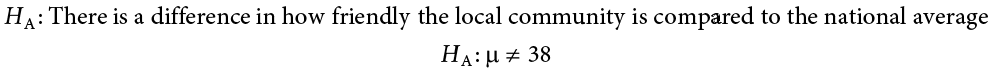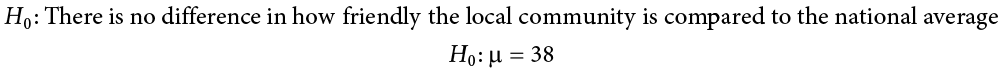 You hear that the national average on a measure of friendliness is 38 points. You want to know if people in your community are more or less friendly than people nationwide, so you collect data from 30 random people in town to look for a difference. We’ll follow the same four-step hypothesis-testing procedure as before.