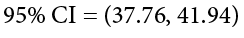 Finally, we can compare our confidence interval to our null hypothesis value. The null value of 38 is higher than our lower bound of 37.76 and lower than our upper bound of 41.94. Thus, the confidence interval brackets our null hypothesis value, and we fail to reject the null hypothesis: