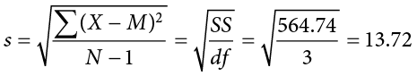 After filling in the first row to get ΣX = 215, we find that the mean is M = 53.75 (215 divided by sample size 4), which allows us to fill in the rest of the table to get our sum of squares SS = 564.74, which we then plug in to the formula for standard deviation from Chapter 3: