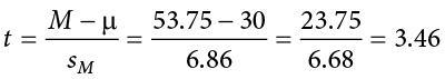 And, finally, we put the standard error, sample mean, and null hypothesis value into the formula for our test statistic t: