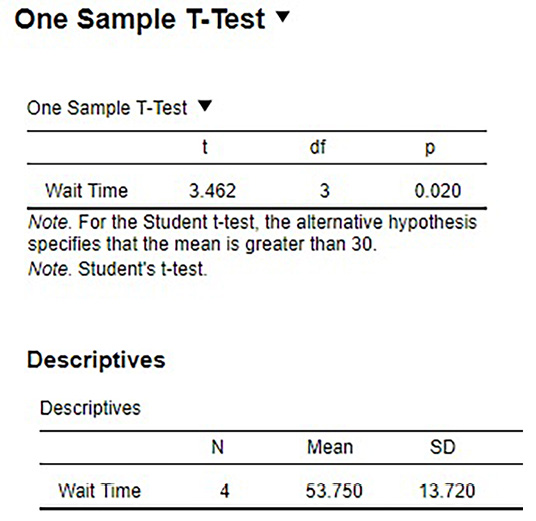 FIGURE 8.3. Output from JASP for the one-sample t test described in this example. The output provides the t value (3.462), degrees of freedom (3), and the exact p value (.020, which is less than .05). Note that the mean (53.750) and standard deviation for the sample are also provided (13.720). Based on our four applicants processing time, the new system takes longer on average (M = 53.75, SD = 13.72) than the  old system to receive benefits, t(3) = 3.46, p = .02.  (“JASP 1-sample t test” by Rupa G. Gordon/Judy Schmitt is licensed under CC BY-NC-SA 4.0.)