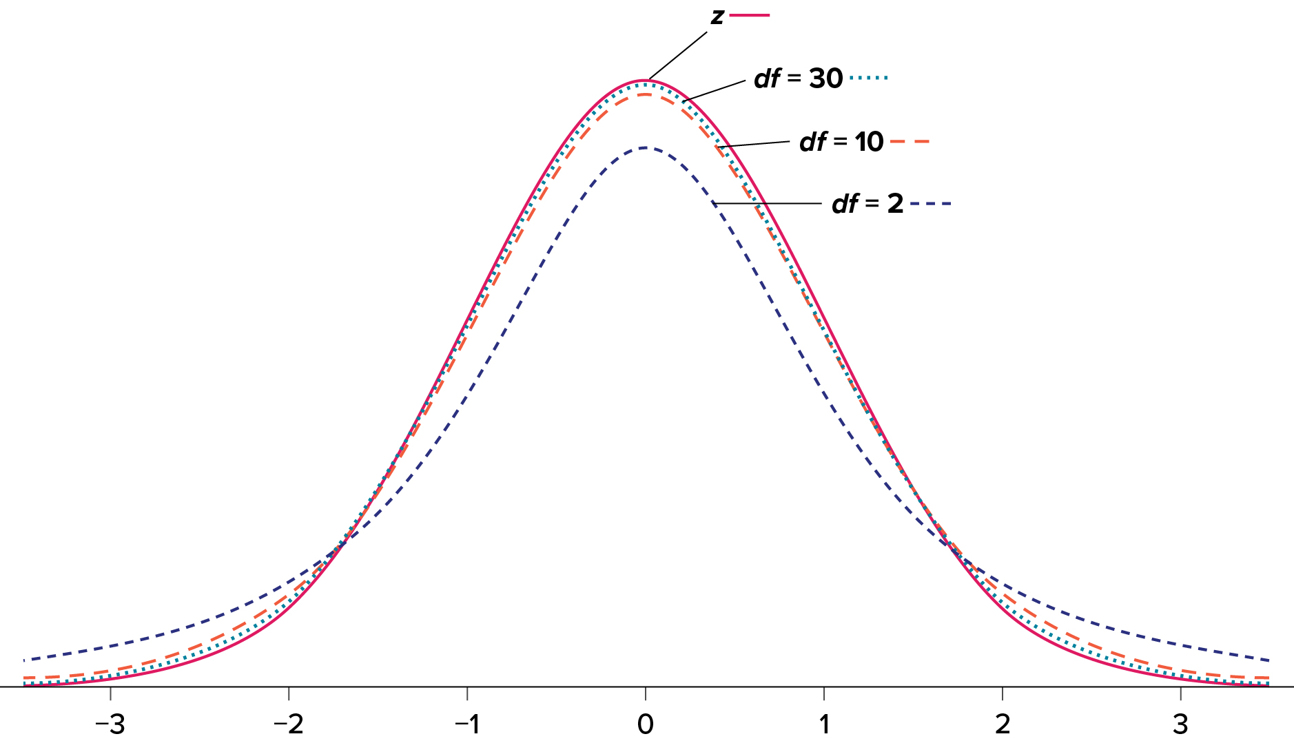 Suppose we’re studying high school graduation rates among Indigenous students in a small district. With only a few students in the sample, our degrees of freedom are low. The t distribution accounts for this extra uncertainty by using “fatter tails.” This means we need stronger evidence to reject the null when our sample is small. In practice, it keeps us cautious about making sweeping claims from limited data, while still giving us a method to test hypotheses.